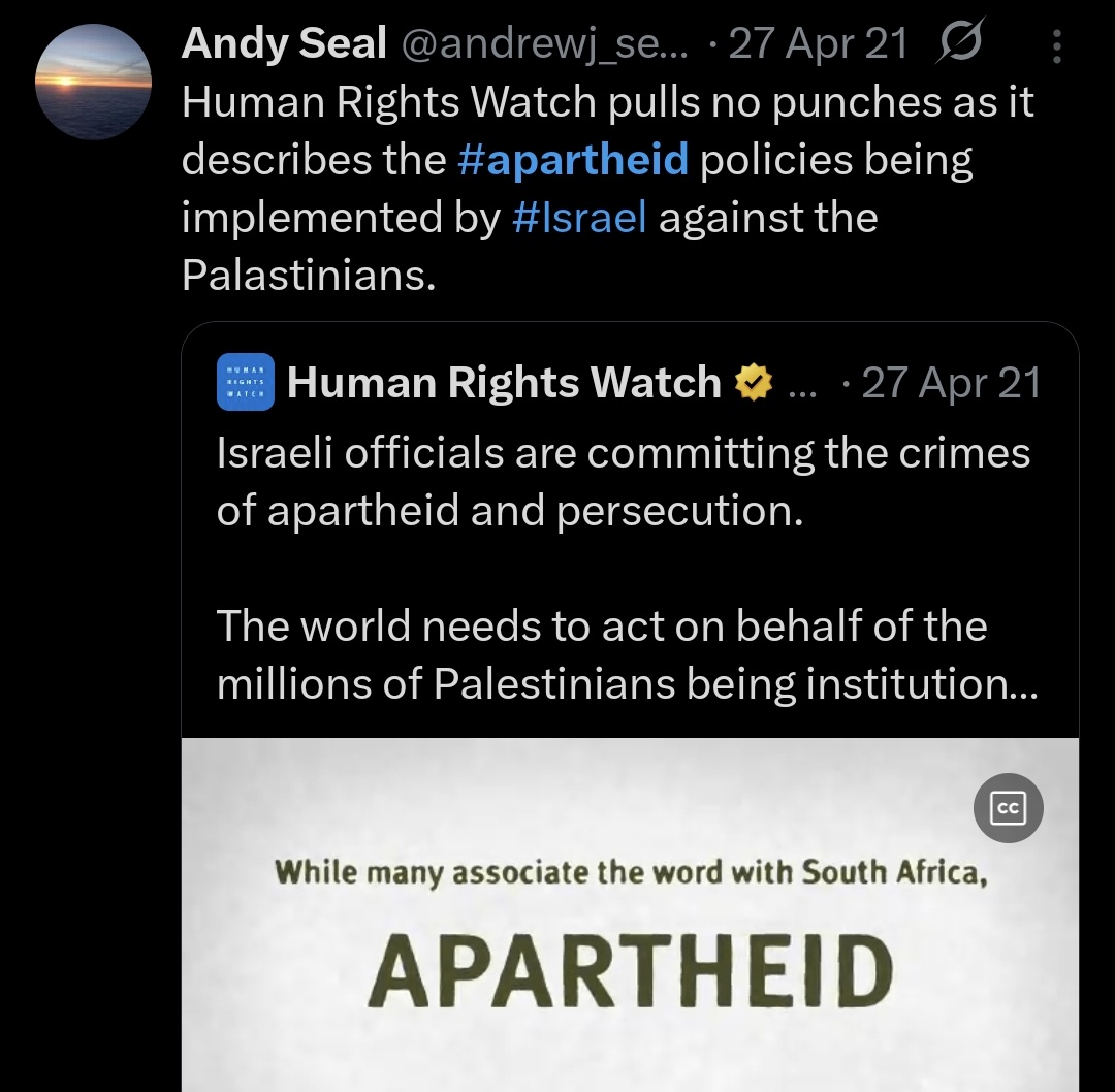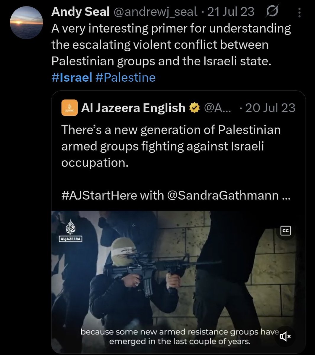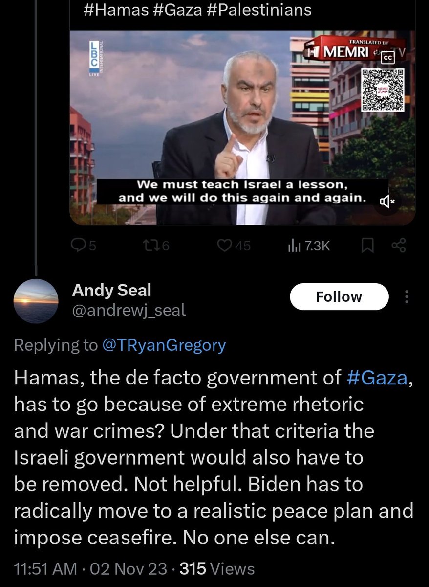 And finally, in response to a video of Hamas official Ghazi Hamad vowing to commit October 7th's again and again, Andrew responded that Hamas shouldn't have to be forced from power because Israel's also bad 🤷♂️