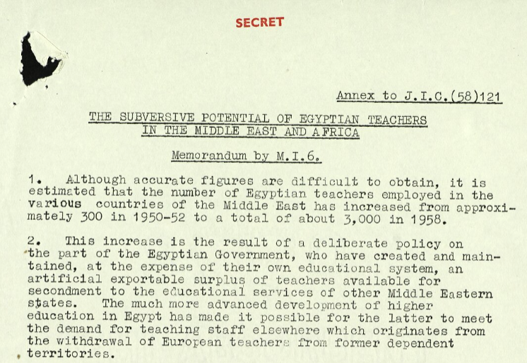 In 1958 the JIC circulated an MI6 memo about the subversive threat of Egyptian school teachers in the ME/Africa region - in the eyes of British intelligence, they were a front for subversion and espionage!