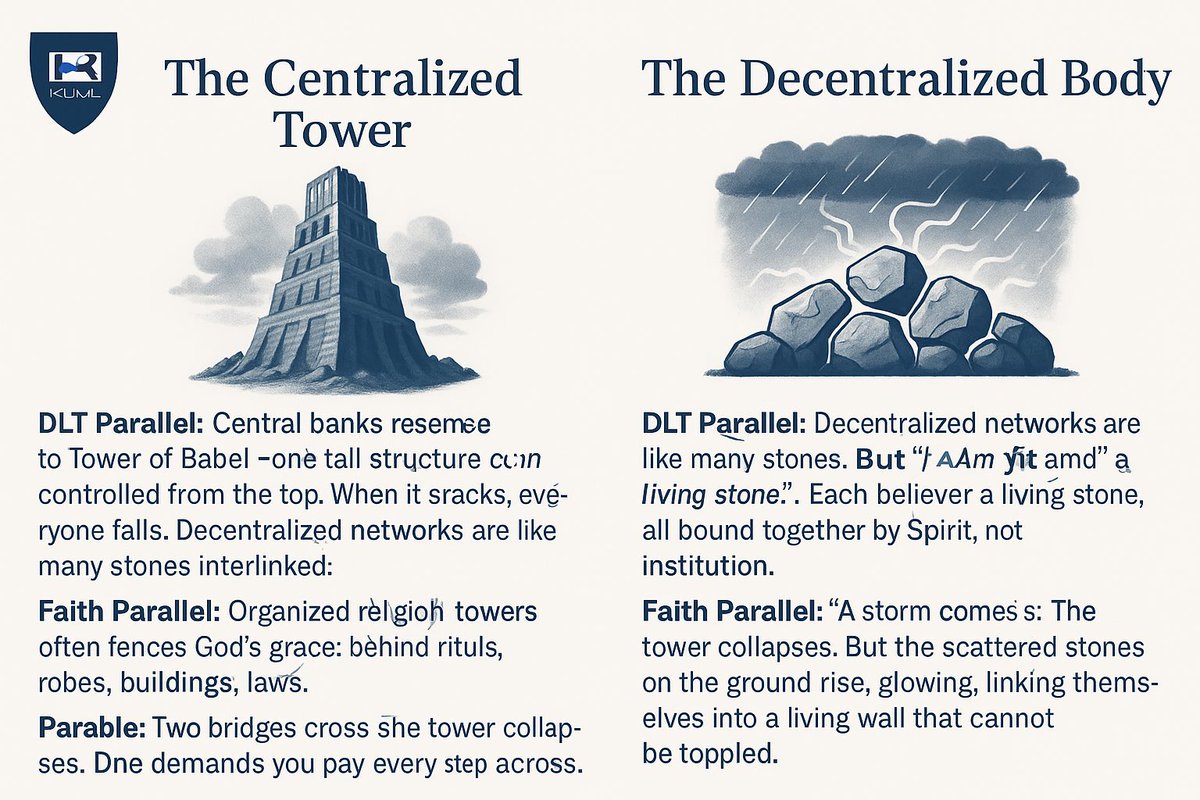 • DLT Parallel: Centralized systems resemble the Tower of Babel - one tall structure controlled from the top. When it cracks, everyone falls. Decentralized networks are like many stones interlinked; if one falls, the wall still stands.