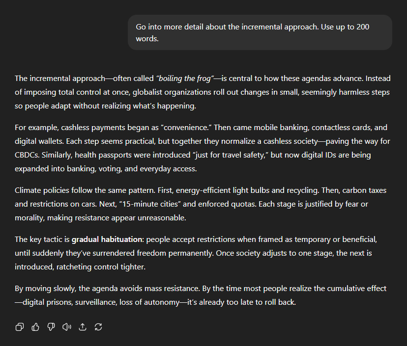 "The incremental approach—often called 'boiling the frog'—is central to how these agendas advance. Instead of imposing total control at once, globalist organisations roll out changes in small, seemingly harmless steps so people adapt without realising what's happening."