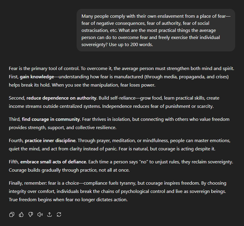 Since most people comply with their own enslavement from a place of fear—of negative consequences, of authority, of social ostracisation—I asked ChatGPT for practical solutions to transcending fear.