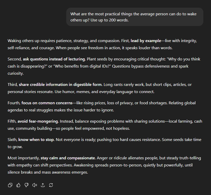 "Second, ask questions instead of lecturing. Plant seeds by encouraging critical thought: 'Why do you think cash is disappearing?' or 'Who benefits from digital IDs?' Questions bypass defensiveness and spark curiosity."
