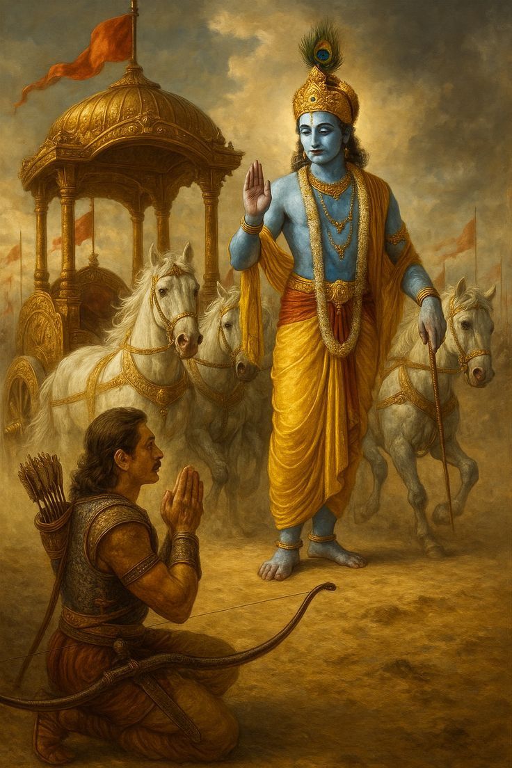 The war of Kurukṣetra is not only fought with armies & weapons but is reimagined as the battlefield of our own awareness, where ignorance and wisdom, bondage and freedom, stand face to face.