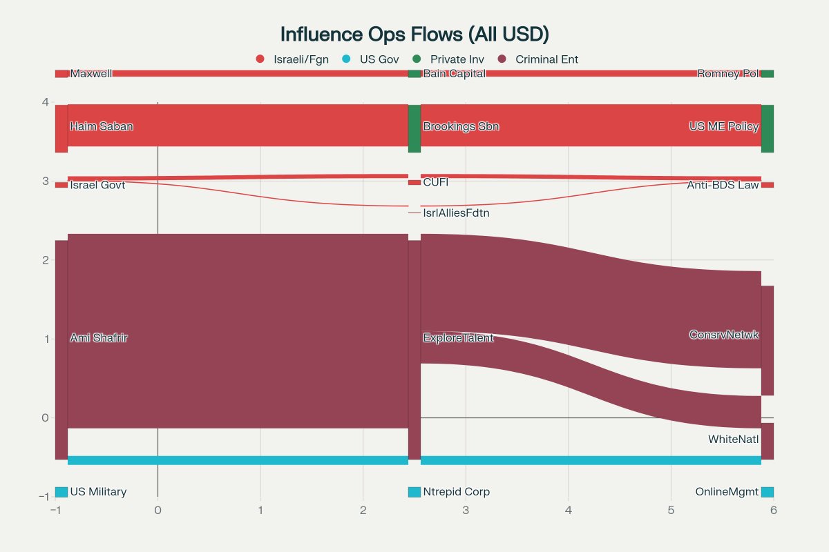 Financial Flow Analysis: Multi-National Influence Operations ($97+ Million Documented). Sankey diagram showing money flows from Israeli intelligence sources, criminal enterprises, & U.S. government to intermediate organizations and final targets. Documented funding exceeds $97m.