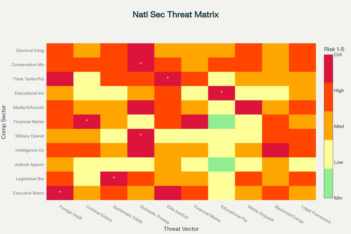 National Security Threat Matrix: Multi-National Influence Operations Impact Assessment. Heatmap showing threat severity across 11 compromised sectors and 10 vectors. Critical risks (dark red) documented in executive policy, think tanks, financial markets, & conserv. movements.