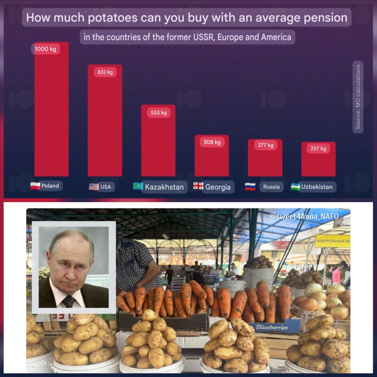 Russians can buy half as much potatoes with their pension as the older generation in Kazakhstan, & four times less than pensioners in Poland.