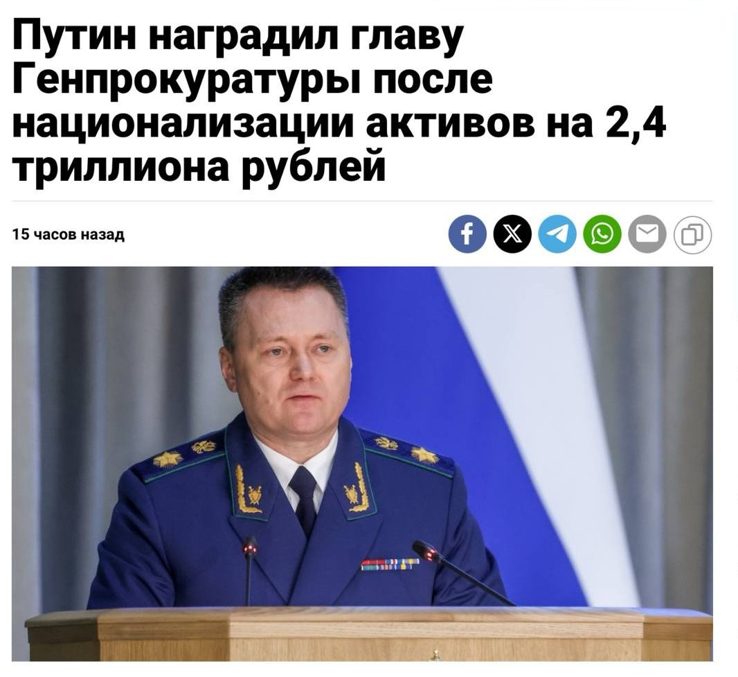 Putin awarded the title of ยซdistinguished lawyer of the ๐ท๐บ Federationยป to Prosecutor-General Krasnov who distinguished himself in the seizure of ๐ท๐บ property.