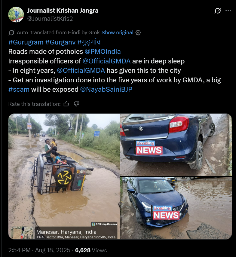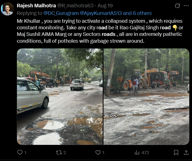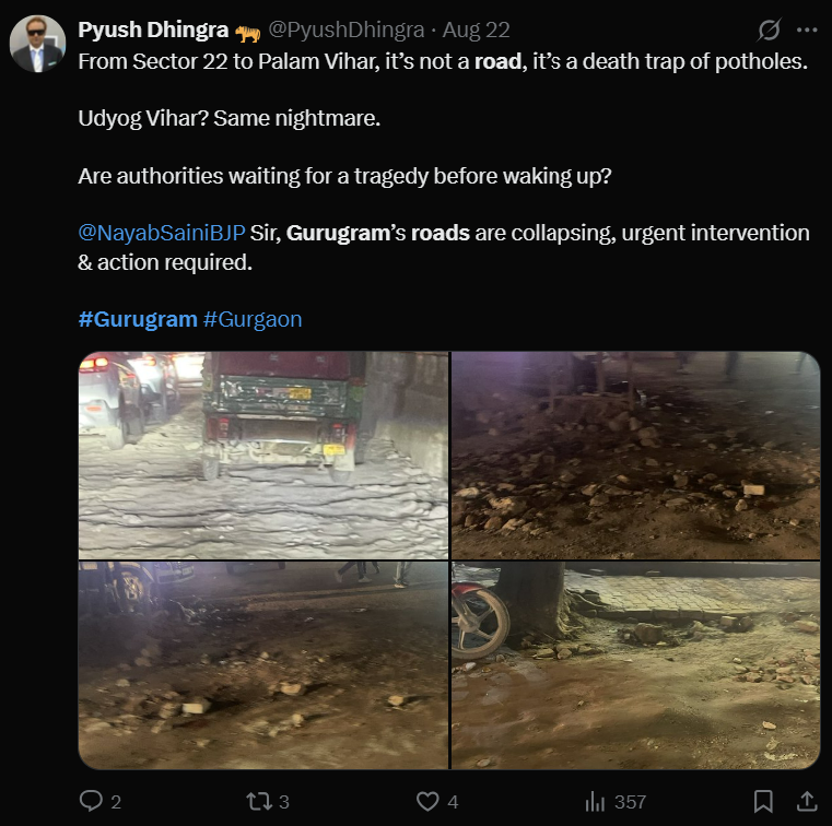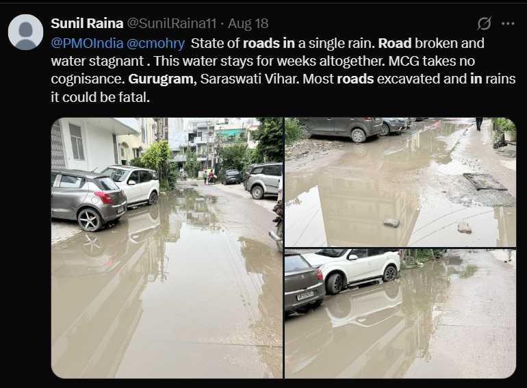 11.1 Sharing a few snapshots of complaints from Gurugram residents, exposing the pathetic potholes and road conditions every monsoon