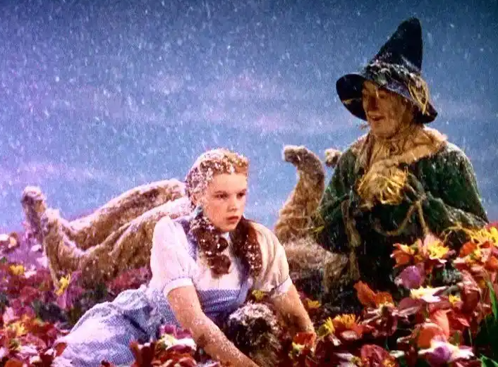 Dorothy and the Lion fall asleep in a snow-covered poppy field. It wasn’t filmed using real snow, but rather 100% industrial-grade chrysotile asbestos. There were no health problems reported afterwards thankfully.