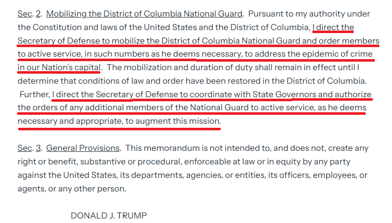 "I direct the Secretary of Defense to mobilize the District of Columbia National Guard and order members to active service, in such numbers as he deems necessary, to address the epidemic of crime in our Nationโs capital."