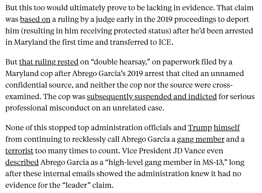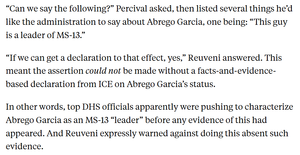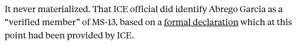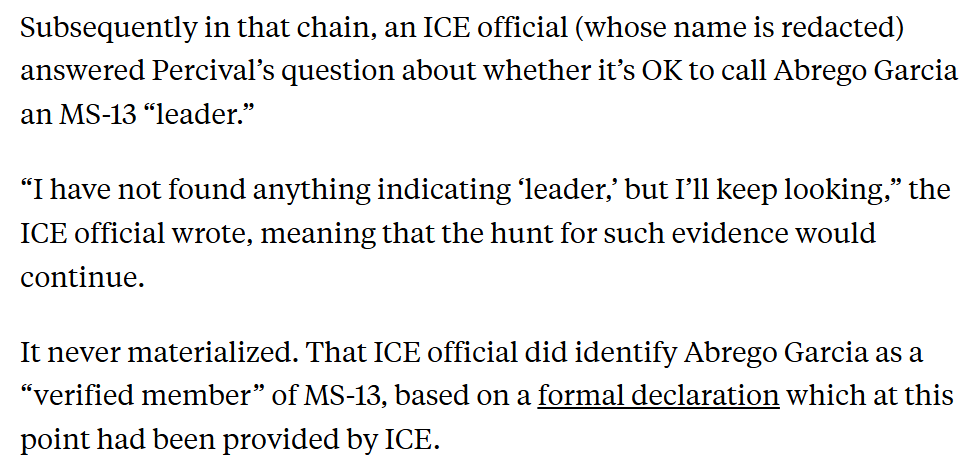 ICE released declaration that he was "verified member" of MS-13, but proof of this never materialized, either. It was rooted in a judge's declaration that proved to be based on incredibly thin evidence. Trump, Vance used this to smear him for months. 5/