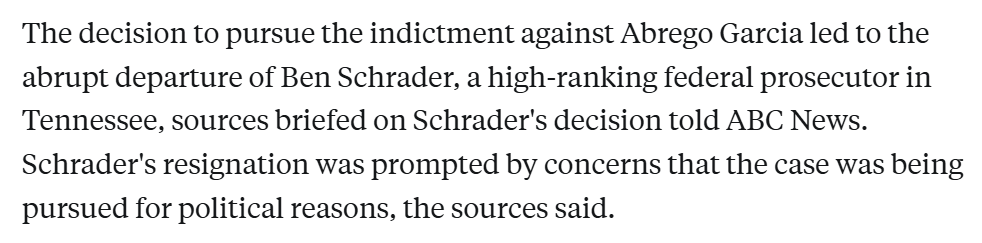 After Trump finally caved and brought Abrego back, the admin moved to prosecute him for trafficking. But don't forget this: A leading prosecutor in the office bringing the case resigned. The reason was plainly that the prosecution stank to high hell. 7/