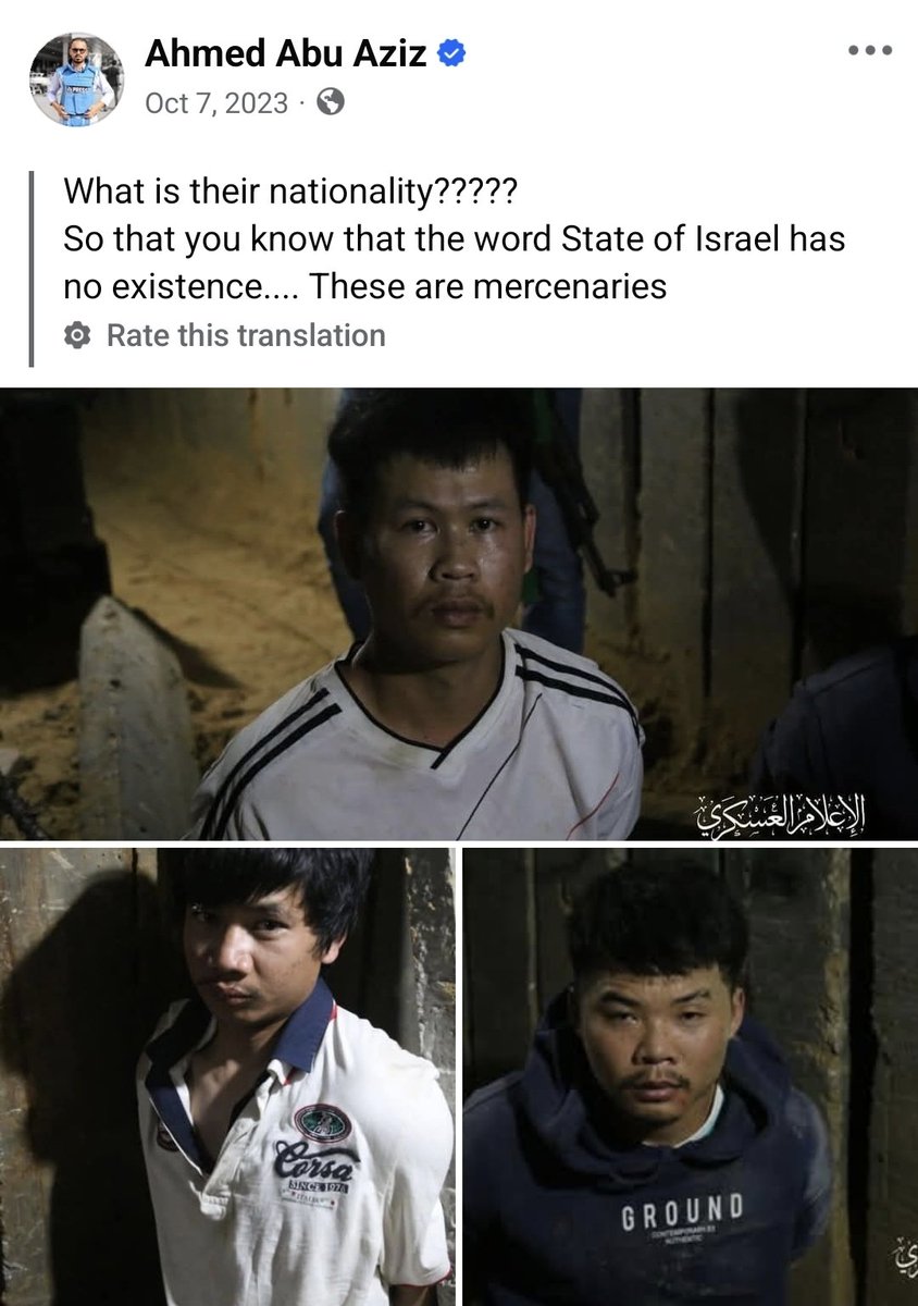Here he is spreading Hamas propaganda, parading the innocent Thai workers who were cruelly taken hostage, and referring to them as "mercenaries".
