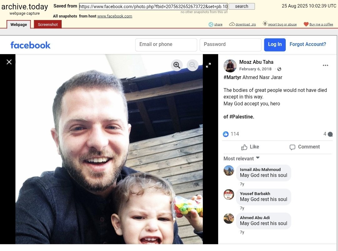 And in 2018, he glorified Ahmad Jarrar, a Hamas terrorist who coordinated the terror attack in which Rabbi Raziel Shevach, a father of six, was murdered. Jarrar was subsequently killed in a shootout with the IDF.