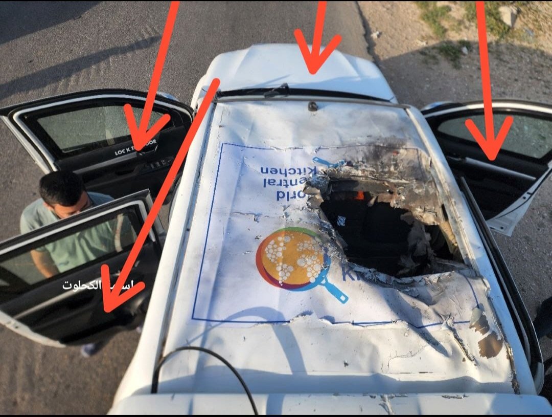 I have just looked at the photos published by the Palestinians of the car belonging to the international organization WCK, I have several question marks, the first photo shows the car in good external condition but with a hole on the roof.