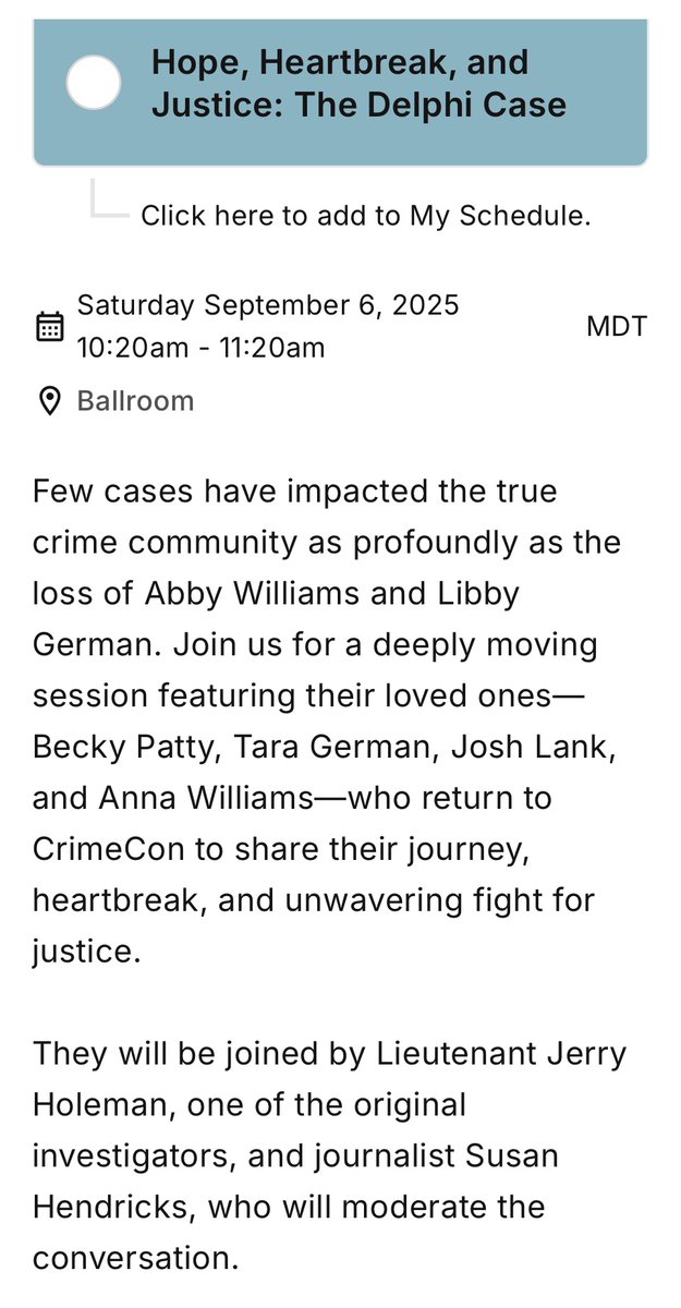 "They will be joined by Lieutenant Jerry Holeman, one of the original investigators, and journalist Susan Hendricks, who will moderate the conversation. This session offers an intimate look at how the families continue to honor Abby and Libby’s legacy, pursue truth, and keep their memories alive." crimecon2025.sched.com/event/27alR/ho… #CrimeCon #Delphi #DelphiMurders