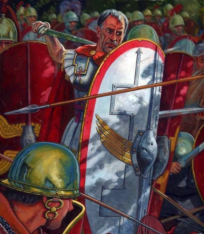 When he saw his men close to breaking, he snatched a shield and rushed to the front line, calling his remaining centurions by name, and ordering them to advance with him!
