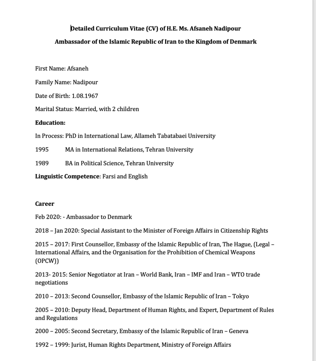 9/ Check out her CV: Afsaneh Nadipour has served the murderous regime for 33 years — including as an assistant to Minister of Propaganda Javad Zarif.