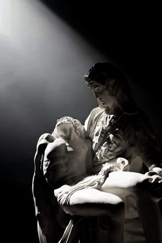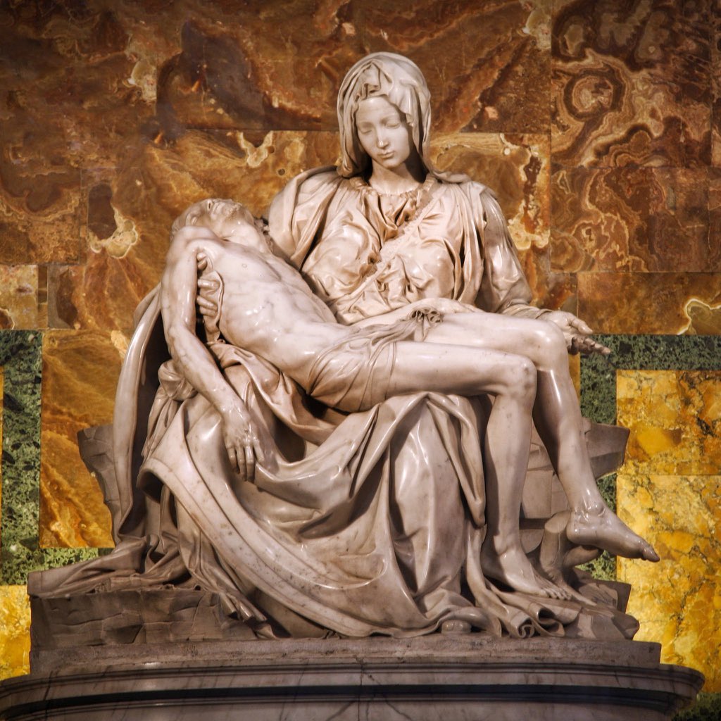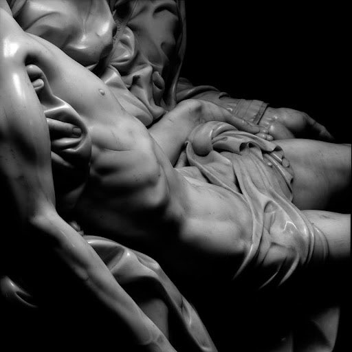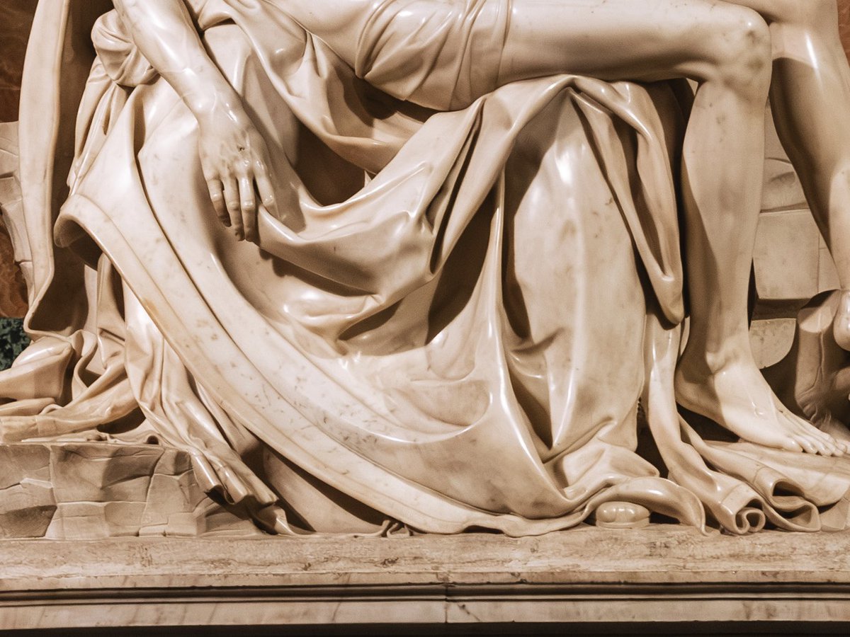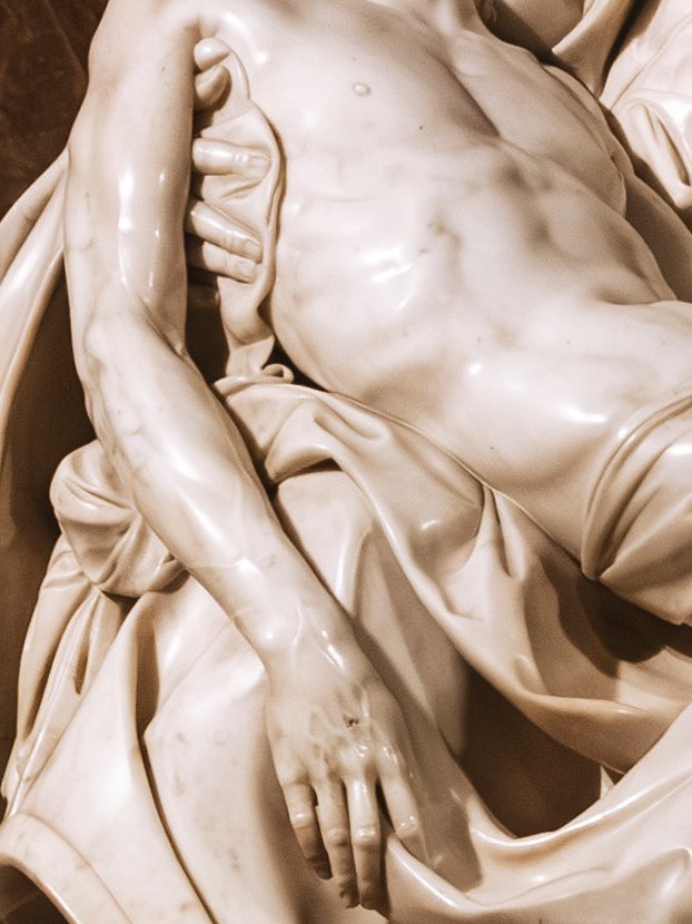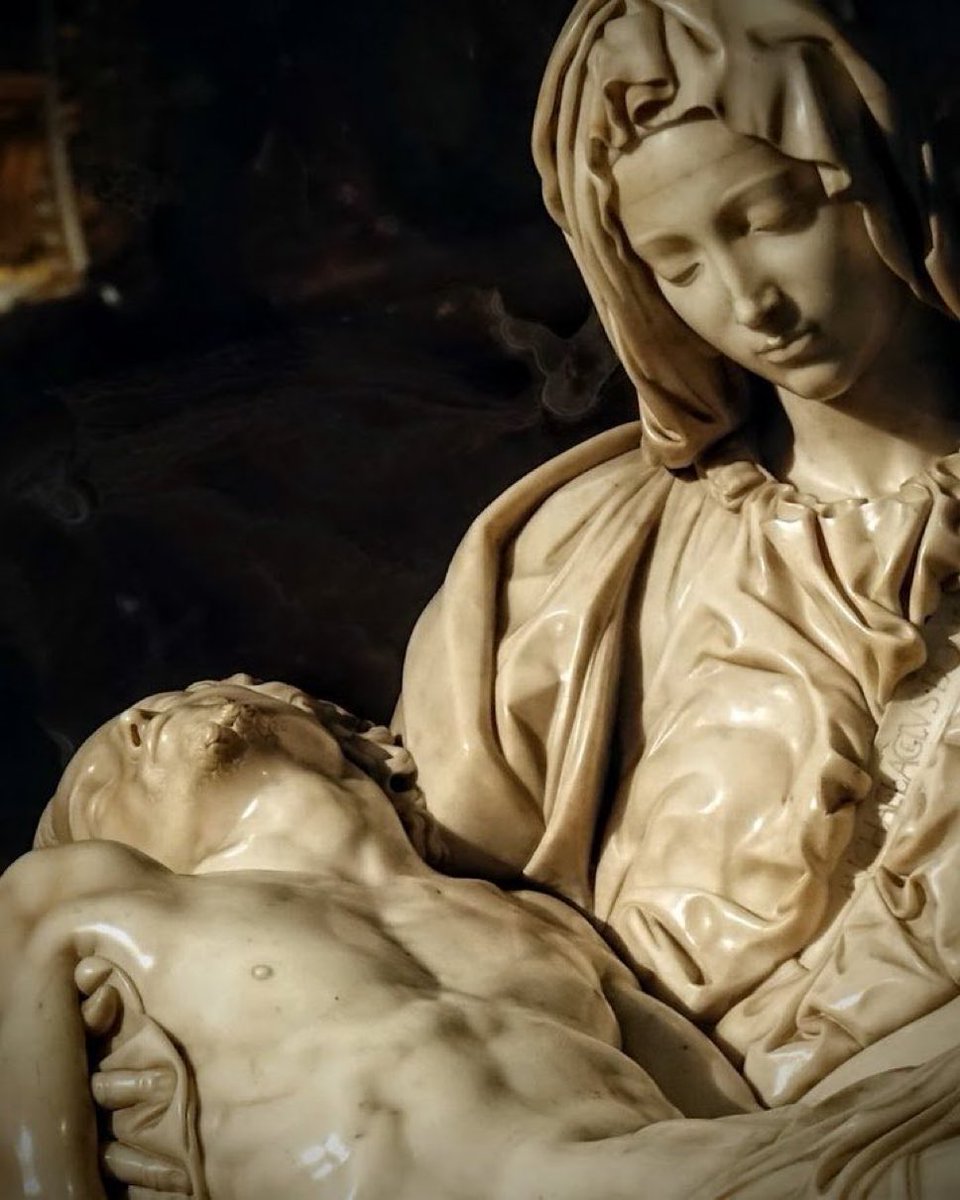The main challenge for Michelangelo was, how could a small woman realistically support a full grown man’s body without looking awkward or unbalanced?