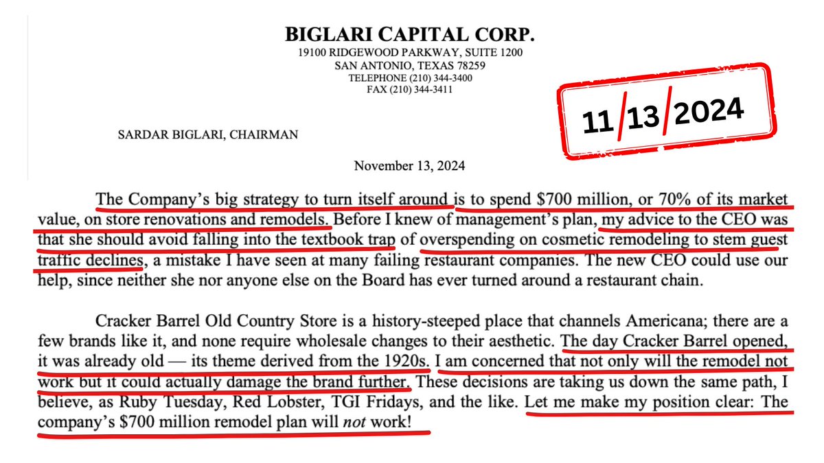@CrackerBarrel CEO Julie Felss Masino and her board ignored warnings last year from investor Sardar Biglari that her "strategic transformation plan" and rebrand was "obvious folly."
