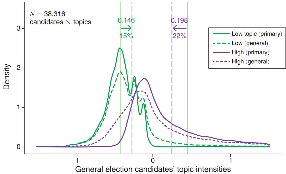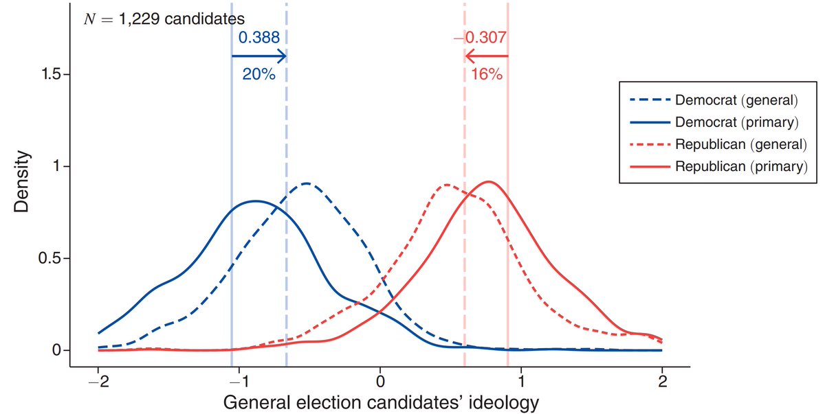 The primary way competitive elections moderate and depolarize is therefore not through actually moderating candidates.
