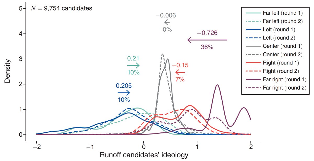 The same thing is observed in France, where the multi-round elections come with extensive moderation for some, slight moderation for others, and essentially no moderation for those who are already at the nation's center.