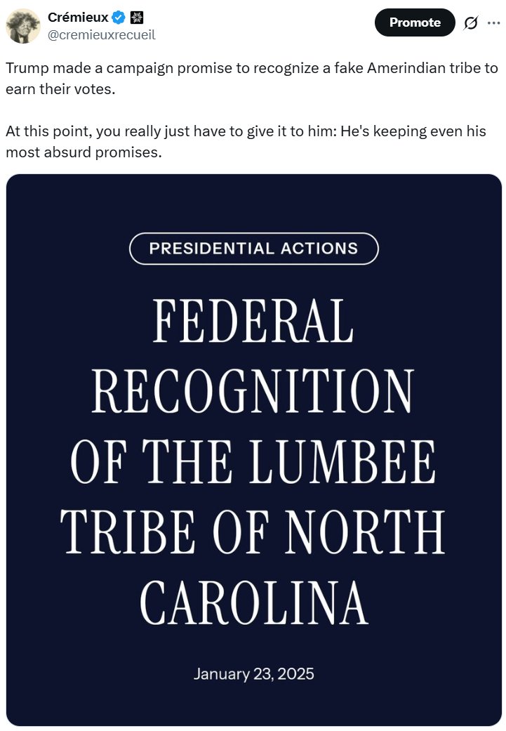 It's been a surprise to see Trump sticking to his 2024 campaign motto of "Promises made, promises kept" for even ridiculously silly promises, like recognizing a group of African Americans as an official native tribe.