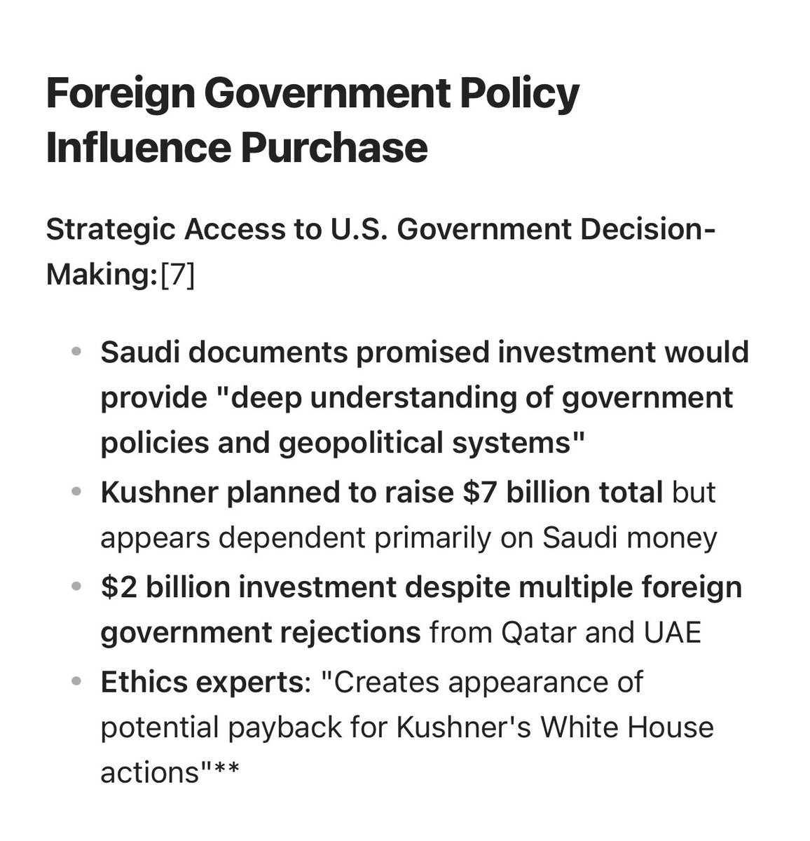 • Saudi Arabia: $2.6B+ (Kushner $2B + Boeing $37B + lobbying coordination)