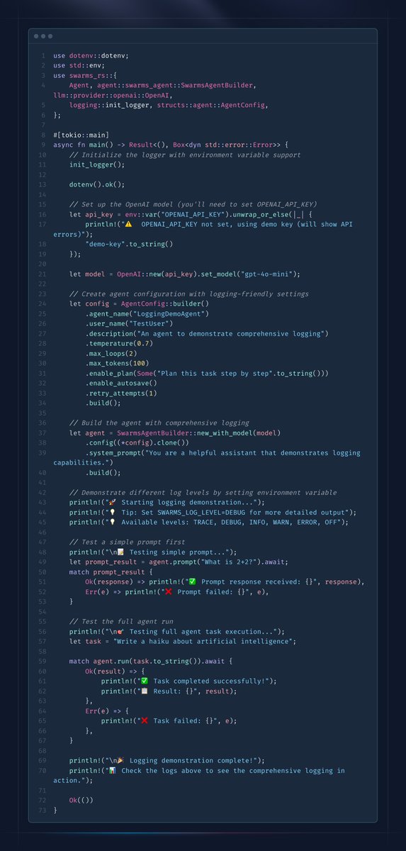 The new logging system in swarms-rs provides a feature-rich, colorful logging infrastructure specifically designed for multi-agent systems. It includes: