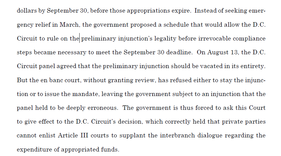 Second, you might be wondering why @TheJusticeDept is seeking emergency relief in a case it *won*. Even though the DC Circuit deemed the district court's injunction patently unlawful, that injunction dissolves only when the DC Circuit issues its formal mandate. 3/