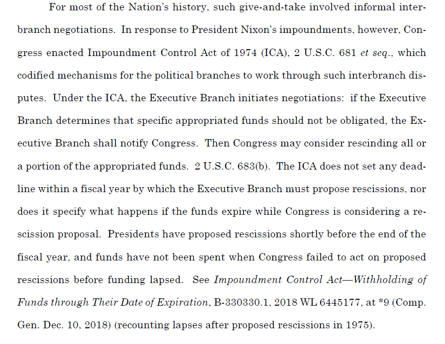 But everything changed at one of our all-time nadirs of presidential power--the post-Nixon era--when Congress, among other things, enacted the Impoundment Control Act. That Act imposes a complex process for rescinding funds, as DOJ explains. 7/