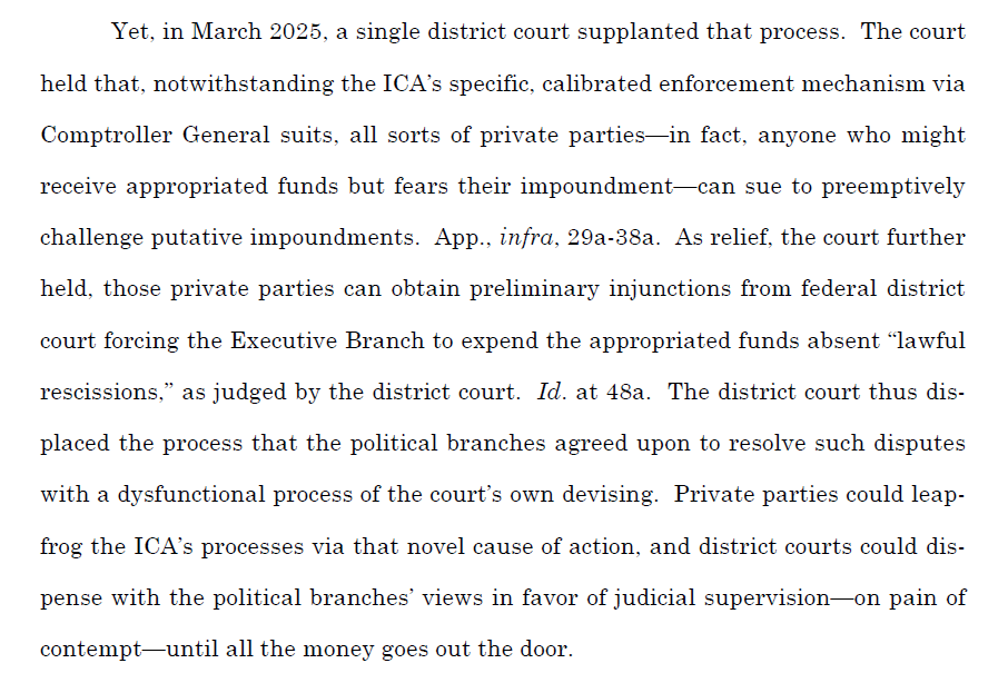 Yet here, "a single district court supplanted that process." One district judge has commandeered the entire USAID appropriation and enjoined the Executive Branch to spend every penny--all without Congress authorizing the underlying suit in the first place. 9/
