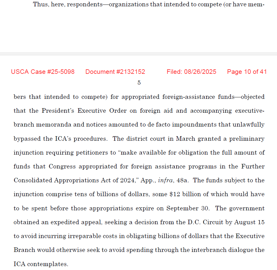 First lets set the stage. This is a suit from various entities that received money from USAID in the past who now want a district court injunction that forces USAID to spend every penny appropriated to it by Congress. 2/