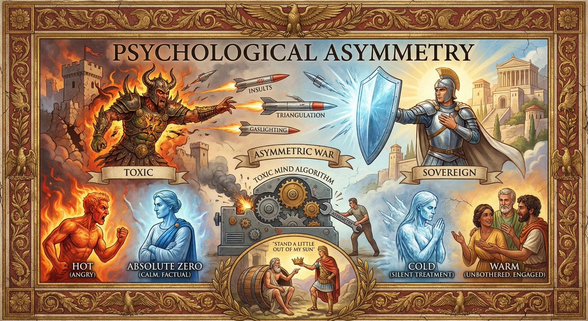 If they are hot—angry, shouting, aggressive—you become absolute zero: calm, factual, slow. If they are cold—silent treatment, withholding, icy—you become warm, unbothered, engaged with others. You become the glitch in their algorithm. The toxic mind relies on predictability. If they push the guilt button and you dispense an apology, the machine works. When you apply asymmetry, the machine jams.