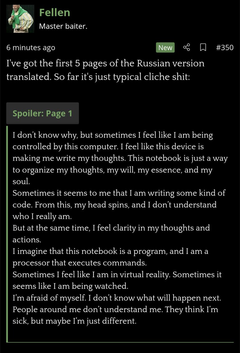Another Kiwi Farms user posts more translated pages of the strange diary.