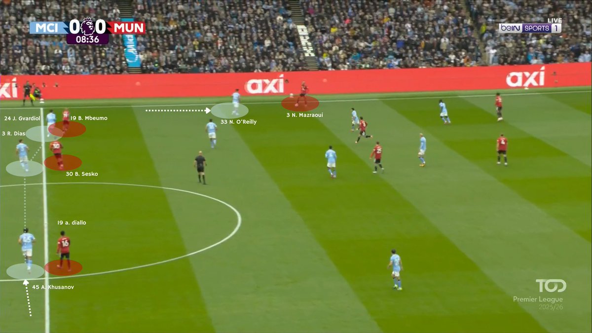 Douvikas, as a false nine, dropped out BTLs, received, and picked out the opposite winger.