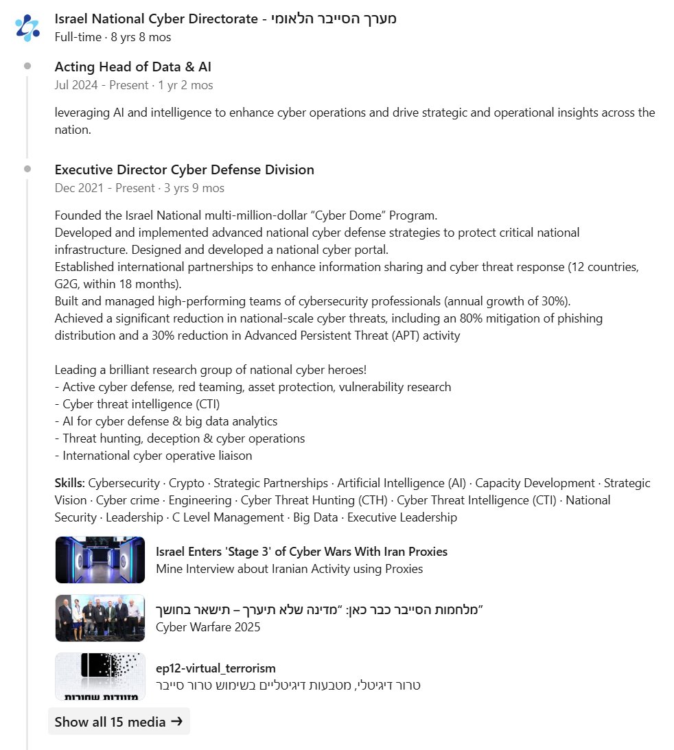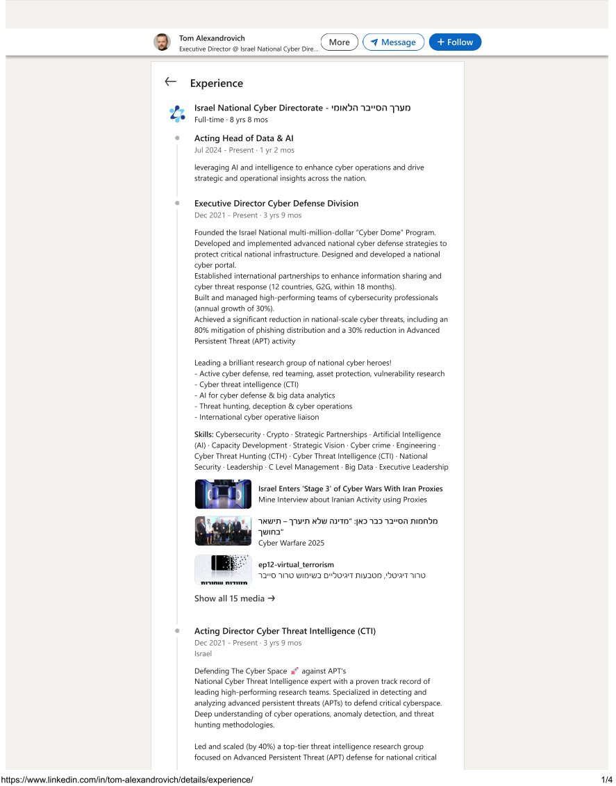 @qaggnews @FrikmanG80295 @Shannonagain2 This one is big--he's the acting head of Data & AI for the Israel national Cyber Directorate, among many other things: linkedin.com/in/tom-alexand…