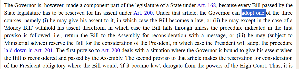 One judgment-house was prerogative and one member approached mylords on whether Article 32 would lie- bear one factor in mind, there are chapters under Constitution- Article 200 in chapter which starts with legislative procedure-Article 196 heading- provisions as to introduction and passing of Bills- that's how legislative process starts and goes to Article 200 and it culminatives when Governor exercises one of the four choices or President exercises Article 201 when bill reserved.