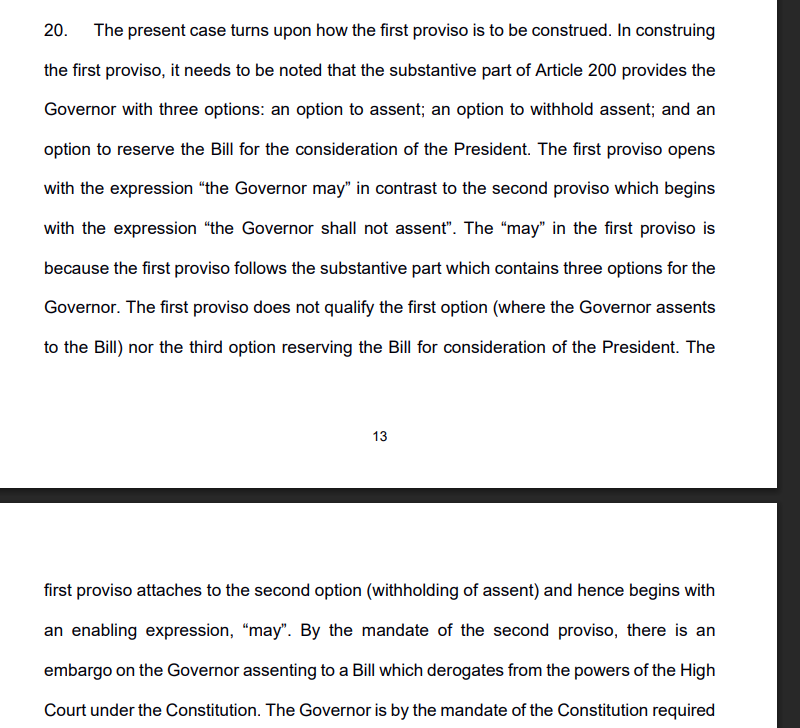 Singhvi: In A. 200, neither main clause or proviso leaves discretion for Governor...it may be stated conceptually, the structure provides for three options read with first proviso which tells the methodology and manner.
