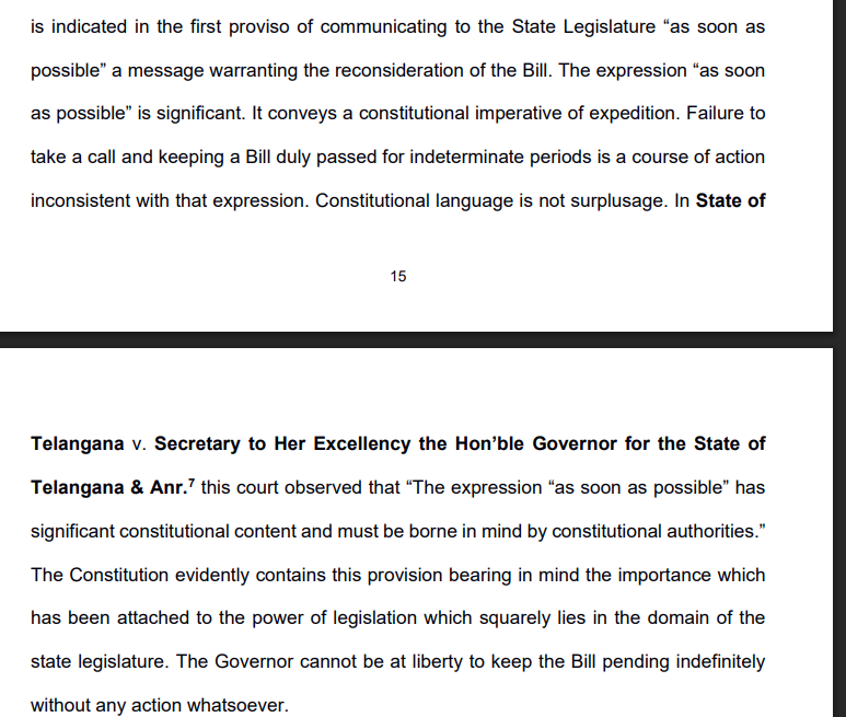 @rashtrapatibhvn CJI: earlier suggestion was 6 weeks but it was made as soon as possible- one member said the purpose was to make it immediately therefore, the framers expected that the Governor would decide expeditiously so can we ignore the expectations of the framers?