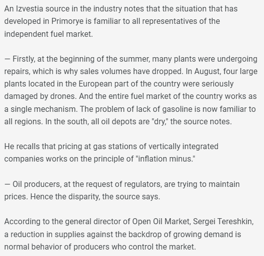 In the south of Russia, oil depots are empty. All fuel is sold off the wheels. There are no reserves. Fuel has been urgently removed from Siberia, which is why the Far East has gone into deep deficit. 3/