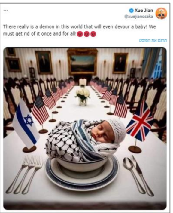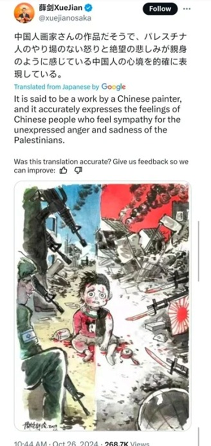 On June 14, Xue Jian, the Chinese consul in Osaka, compared the State of Israel to Nazi Germany. Other posts by the Chinese diplomat after October 7 compared Israelis to the Japanese Imperial Army and shared AI illustrations of Israeli Palestinians as "baby-devouring demons," to use his exact words. Since there was no apology, I have to ask again: are these blood libels Beijing's official positions?