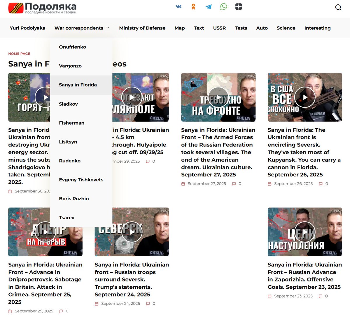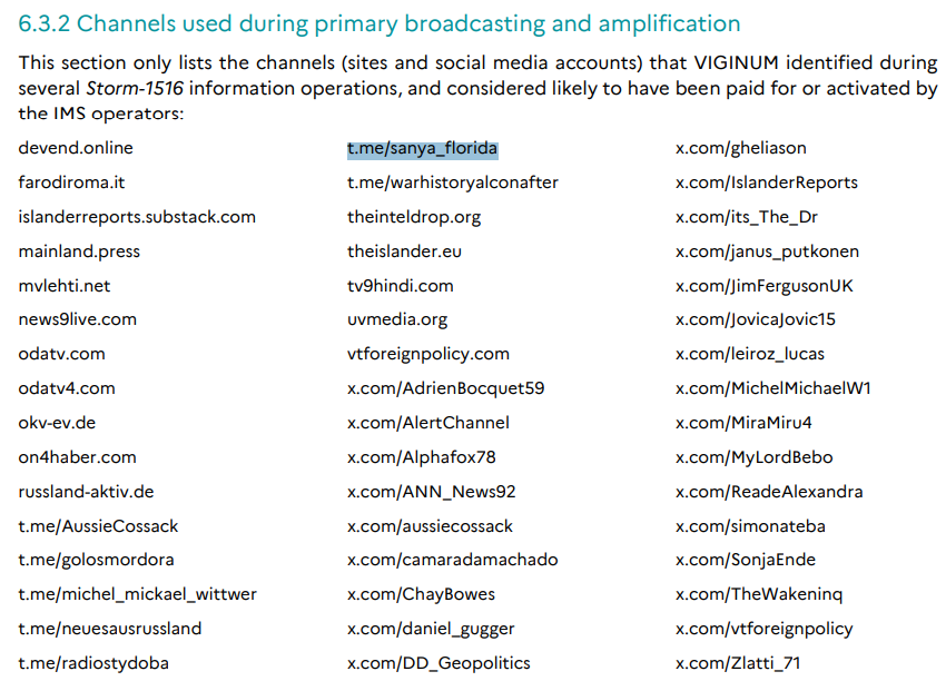 Sanya is also promoted by Kremlin linked and sanctioned Yuri Podolyaka as a war correspondent, despite only filming from his Orlando home.