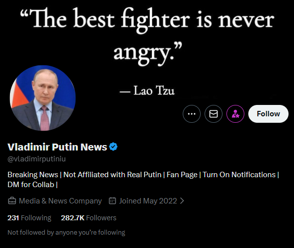 Mustanser runs the 'Vladimir Putin News' account from Pakistan, and has somehow managed to convince 282.7K people to follow him by posting the most basic, common denominator slop on X.