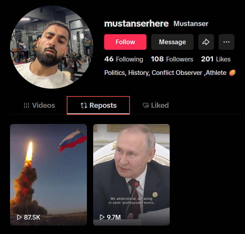 Mustanser describes himself as a "Social Scientist, Content Creator, Analyst" focused on "Politics, History, Observing Conflicts". He recently posted with glee on TikTok about X exposing Indians pretending to be from other countries - ironic he is doing the same but from Pakistan