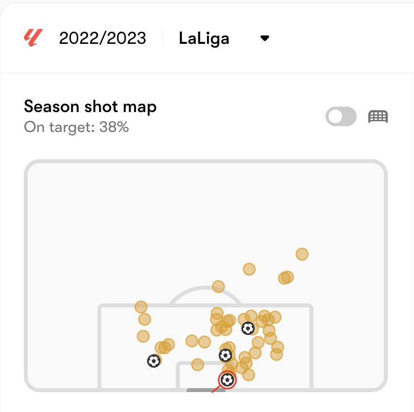 He averaged 1.75 shots and 0.24 xG per 90, and looking at his shot map, his shot selection was pretty good