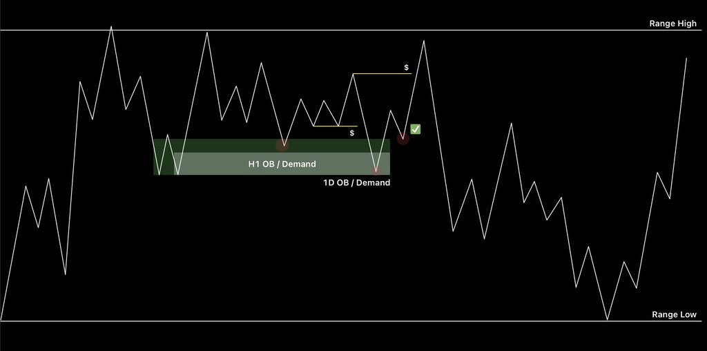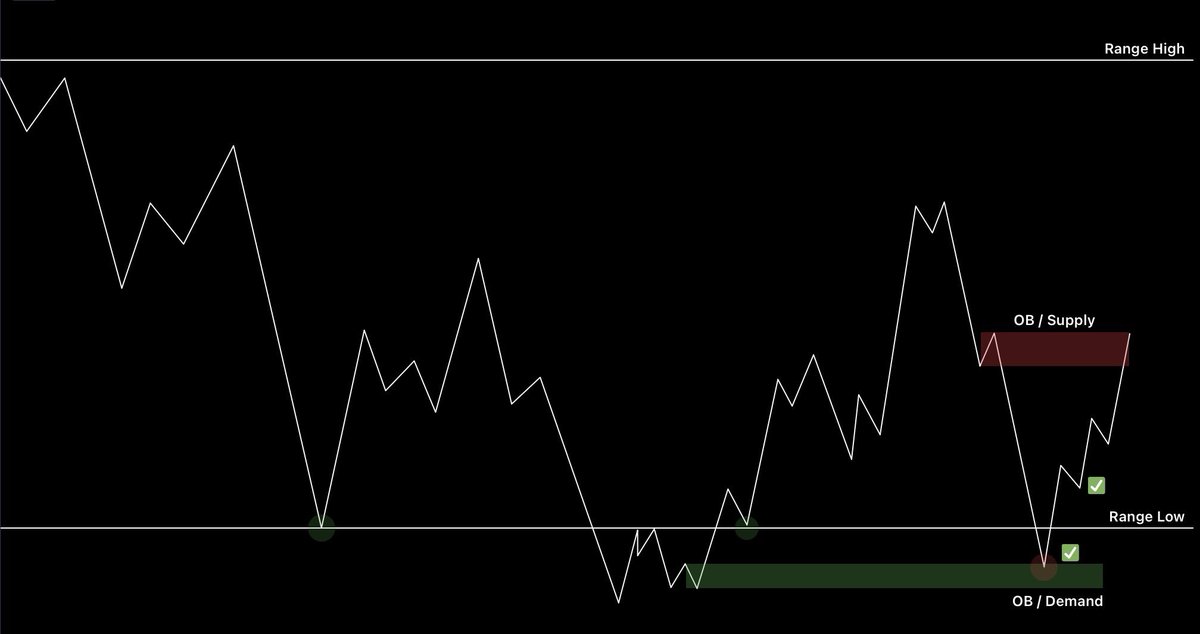 This is a trading model that focuses on range-bound markets—where the price moves back and forth between a high and a low. This strategy involves identifying a "sweep" of the low point of this range.