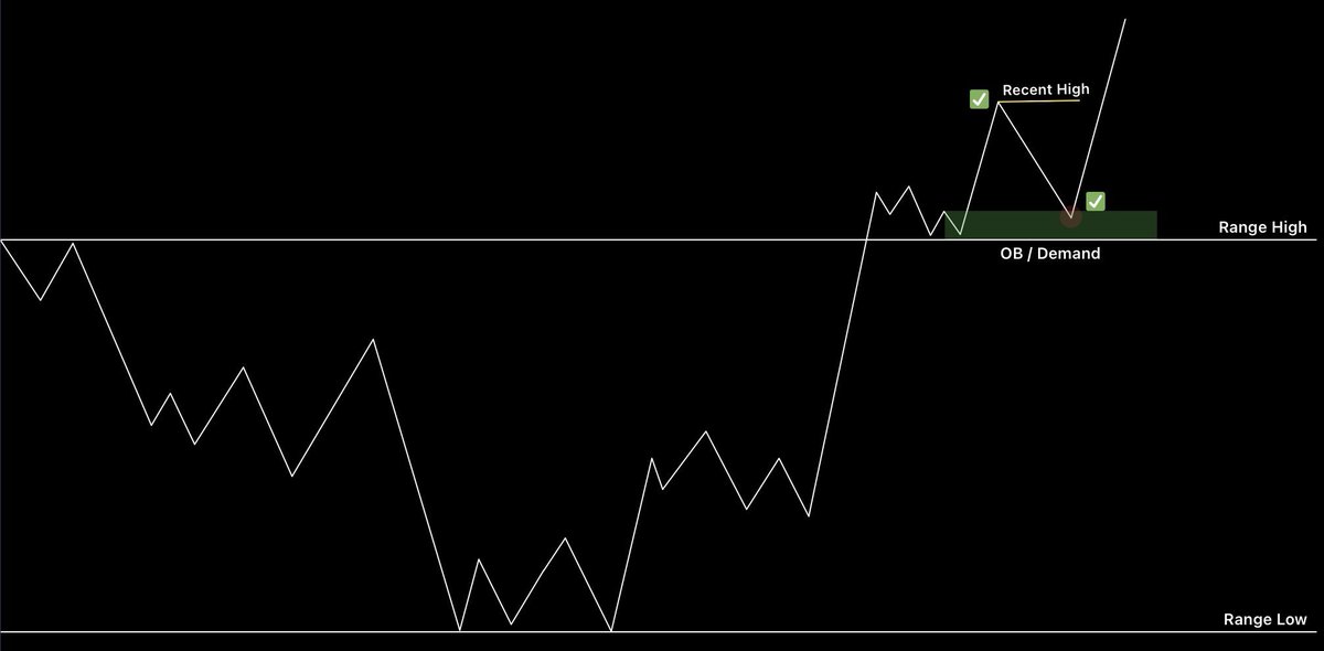 After the price breaks above the range high, you need to look for a specific confirmation: an Order Block (OB) or Demand Zone is created above the high. This is your key signal. It shows that a big player is interested in pushing the price higher, and this is your confirmation that momentum is on your side.