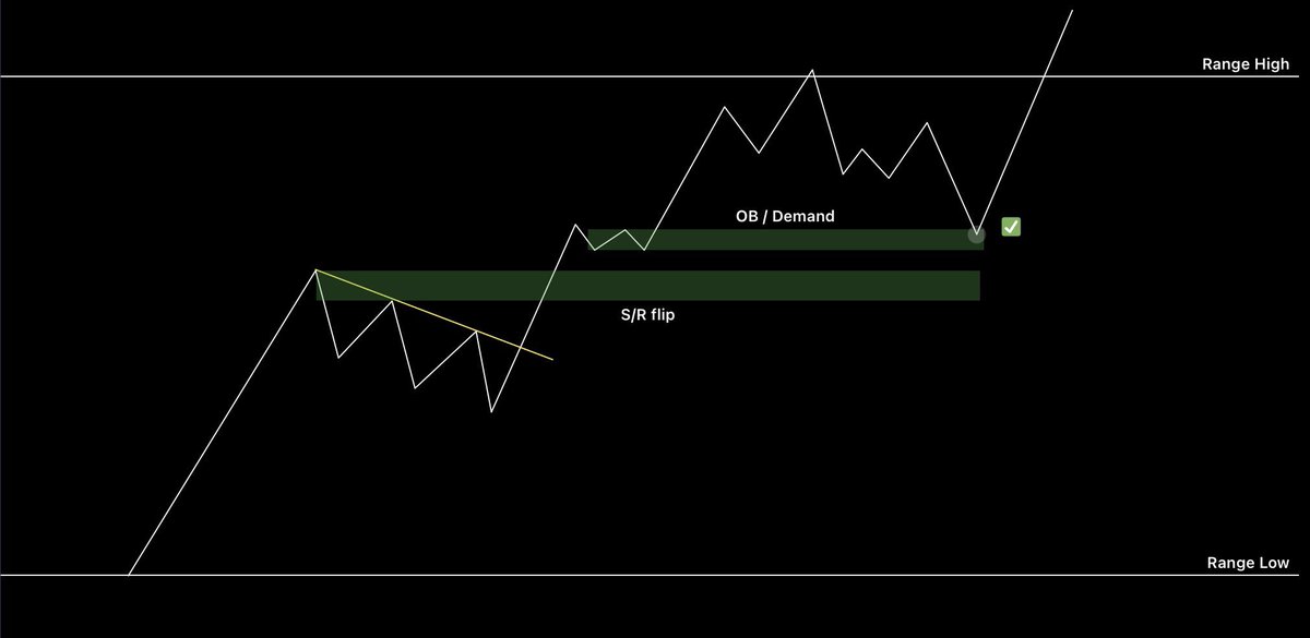 The right approach is to continue with the momentum. Look for an Order Block (OB) or Demand Zone that is present slightly above the obvious S/R level. This is where the real buying power is concentrated, and it's the more logical place for the price to retrace to before continuing its move.