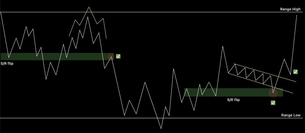 Right Example (Bull Flag): On the right side, after a sweep of the range lows, a new upward trend begins. Following a successful S/R breakout, a Bull Flag pattern forms. You have two options for entry:
